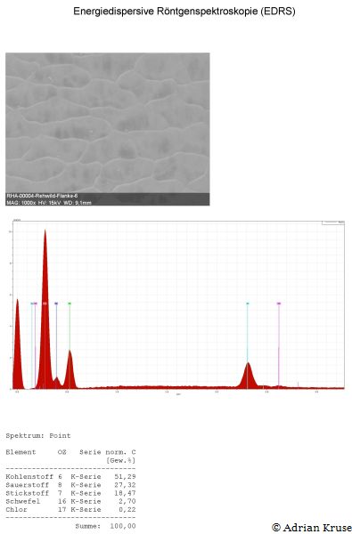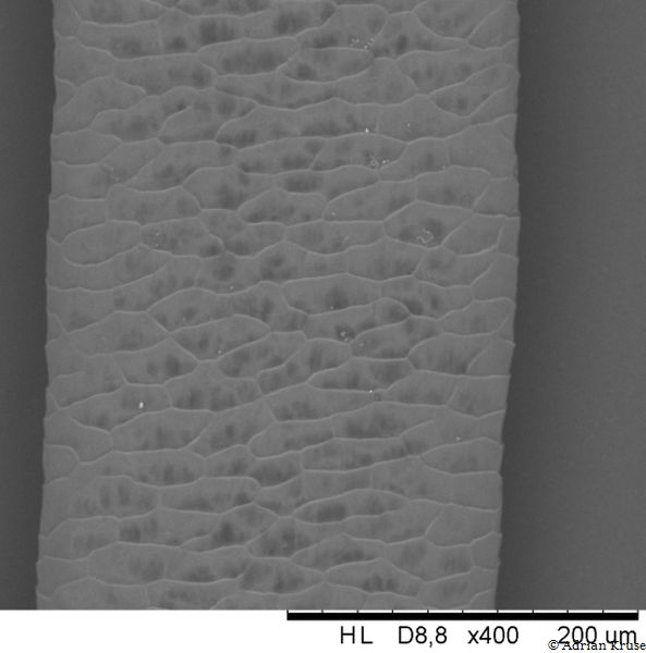 Zur eindeutigen Bestimmung der Tierart sollte die Kutikulastruktur ausgewertet werden. Mit dem Rasterelektronenmikroskop (REM) wird mit Hilfe eines Elektronenstrahls die Haaroberfläche abgetastet und dargestellt. Die Ergebnisse werden jeweils mit Bildern dokumentiert.